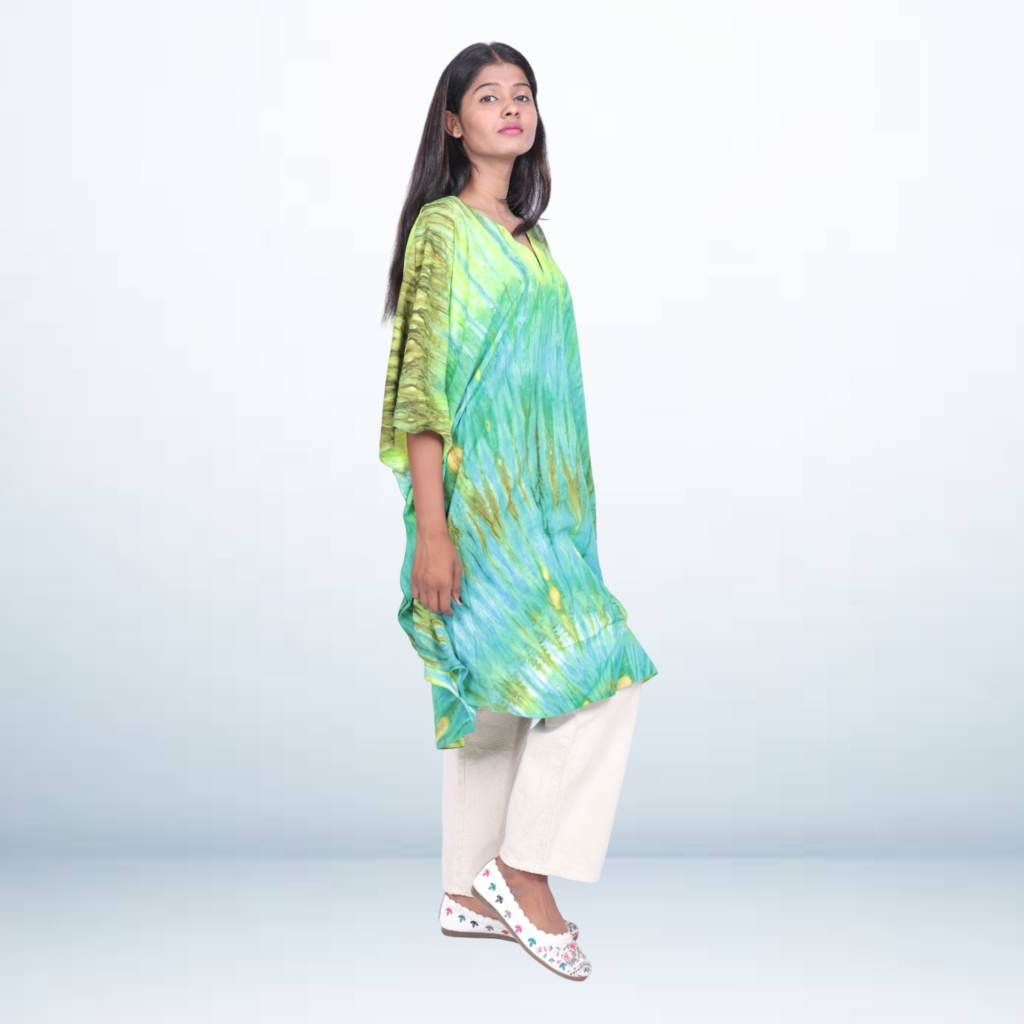 Elevate your everyday look with this Hand Spray Printed Short Kaftan Pant Set, designed for comfort and effortless elegance. The vibrant green and blue hand-spray pattern adds a fresh, artistic touch, while the breathable fabric ensures all-day comfort. The free-size kaftan pairs beautifully with relaxed-fit pants, making it perfect for casual outings, travel, or at-home wear.