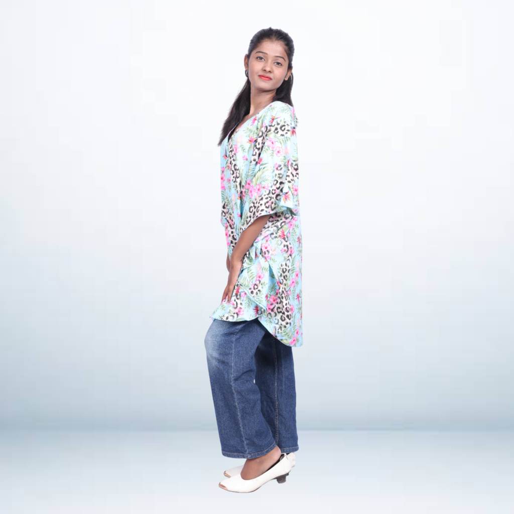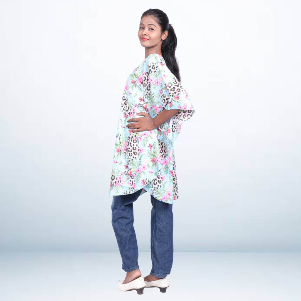 Step into effortless style with this tropical print short kaftan cover-up, featuring a lively mix of floral and animal prints on a soft aqua base. Made from breathable, lightweight fabric, this free-size kaftan offers a relaxed and airy fit — ideal for casual outings or layering over your swimwear. The loose silhouette and flowy sleeves make it both chic and comfortable.