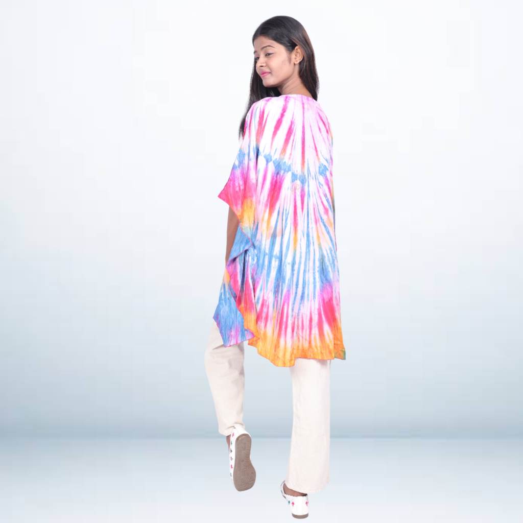 Add color and comfort to your day with this vibrant rainbow tie-dye short kaftan. Made from soft, breathable fabric, it offers a relaxed fit and stylish V-neckline for an easy, flattering look. The bright blend of pink, blue, orange, and yellow shades gives a cheerful touch to your wardrobe. Ideal for casual wear, beach days, lounging, or pairing with jeans and pants for a trendy outfit.