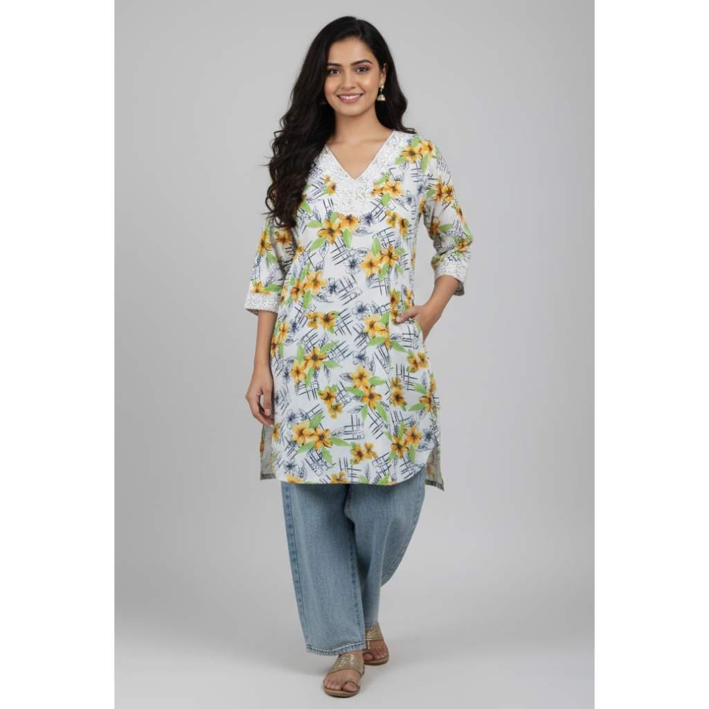 The kurta features a delightful mix of yellow floral prints with artistic abstract strokes, giving it a chic and youthful look. The beautifully detailed embroidered V-neckline adds a touch of sophistication, while the 3/4 sleeves and side slits ensure ease of movement and a relaxed fit.