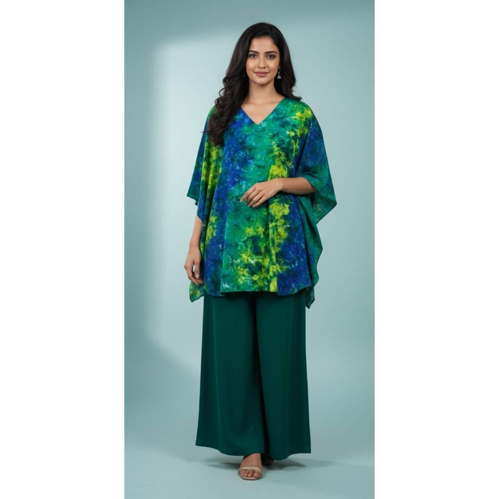 The kaftan-style top features a graceful V-neckline and wide, flowy sleeves that drape beautifully on the body. Crafted from soft, lightweight fabric, it offers breathability and ease of movement throughout the day. The solid green palazzo pants add structure to the look while keeping the outfit effortlessly chic and comfortable.