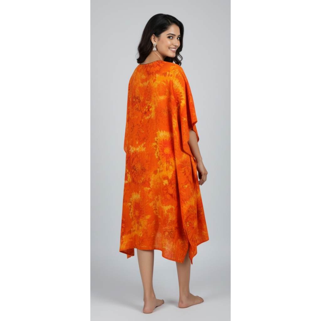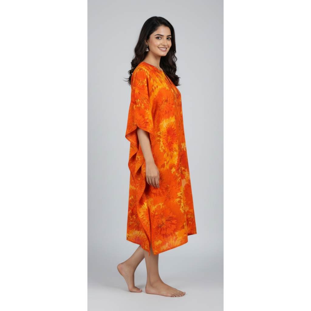 Add a splash of color to your wardrobe with this vibrant orange kaftan dress. Featuring a beautiful all-over printed design and a relaxed, flowy silhouette, this dress offers both style and comfort. The soft fabric drapes gracefully, while the V-slit neckline adds a touch of elegance. Ideal for casual days, resort wear, lounging, or holiday looks, this kaftan dress is a must-have for effortless fashion.